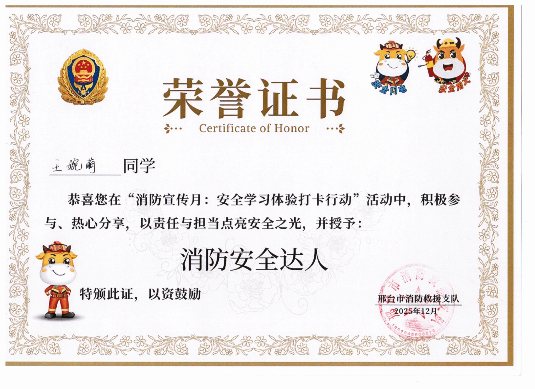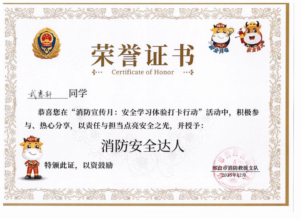 近日,由邢台市消防救援支队主办的消防宣传月“安全学习体验打卡行动”圆满落幕。我校学子积极响应、踊跃参与,共有20名同学获得荣誉证书及精美礼品,充分展现出机电学子重视消防安全、主动学习消防知识的良好风貌。